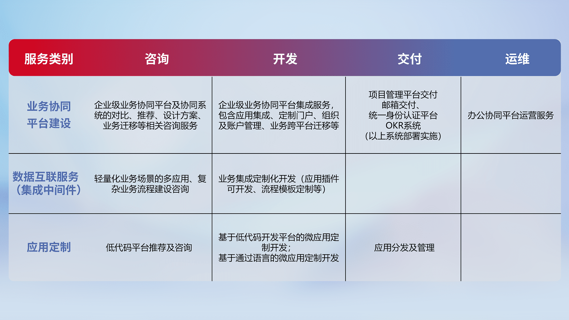 针对钉钉、、、企微、、IDaas等平台级产品提供产品的规划、、方案、、、、交付、、定制化开发等服务,,,实现如统一协同办公、、、智能客户服务、、、、混合会议管理、、、智能数据查询、、等业务场景,,,实现数字化转型。。。。