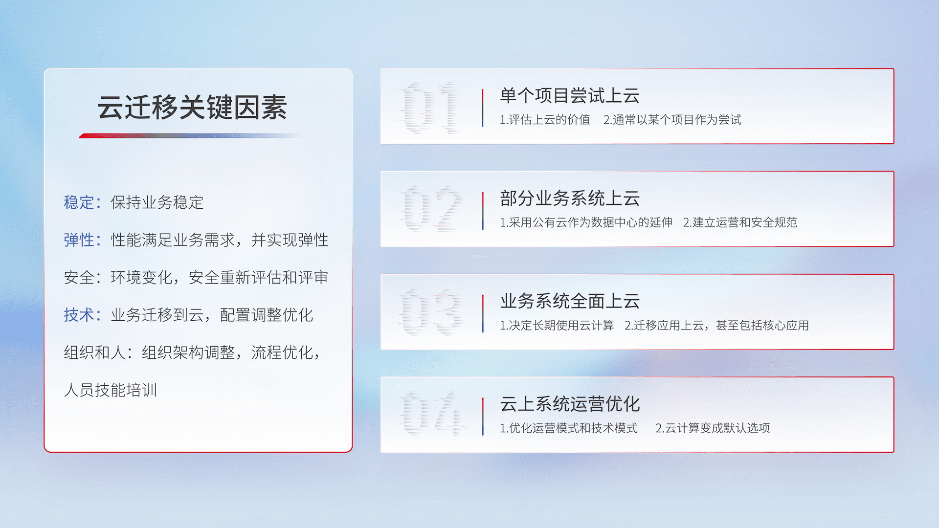 结合实际业务,,,从规划设计、、、云平台选型、、、、云原生改造、、、、数据迁移、、集成交付,,,迁移全过程为客户识别最佳上云路径,,,,做好风险识别管理,,,设计网络架构、、身份权限、、、安全审计合规、、操作审计、、日志审计、、、、监控告警策略、、多站点容灾设计等,,对云上基础设施进行整体规划,,提升IT治理水平,,以满足弹性、、、、高可用、、、高性能的需求。。。。