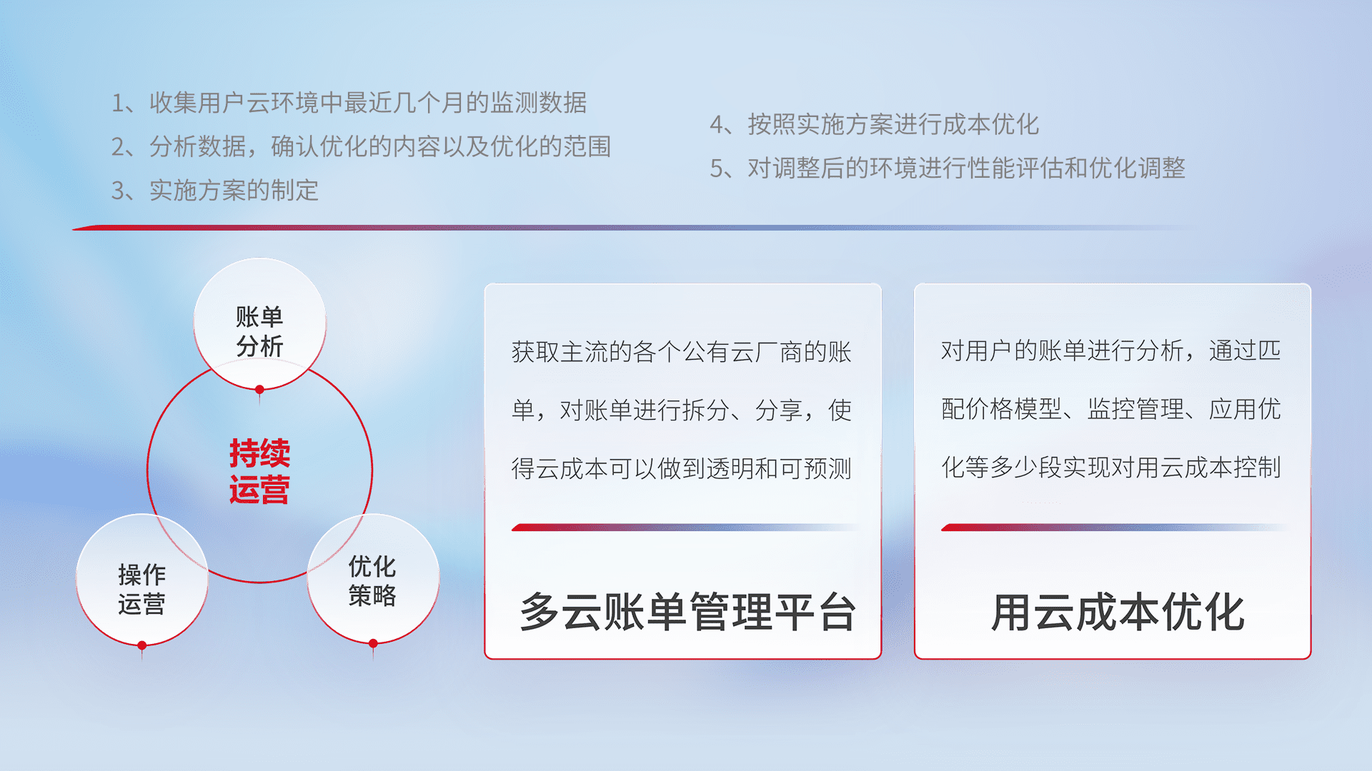 通过多云纳管,,,以统一的资源数据模型把客户的云资源进行抽象和封装,,,,进而实现对多云资源的统一操作,,,保障云资源管理的可靠性、、、稳定性与可用性。。量身定制化运维内容,,配置、、、、开发运维、、、补丁管理、、备份、、、监控、、、、认证和访问管理、、、审计和日常巡检等,,保障在用云过程中的可靠度,,,,稳定度以及高可用率。。