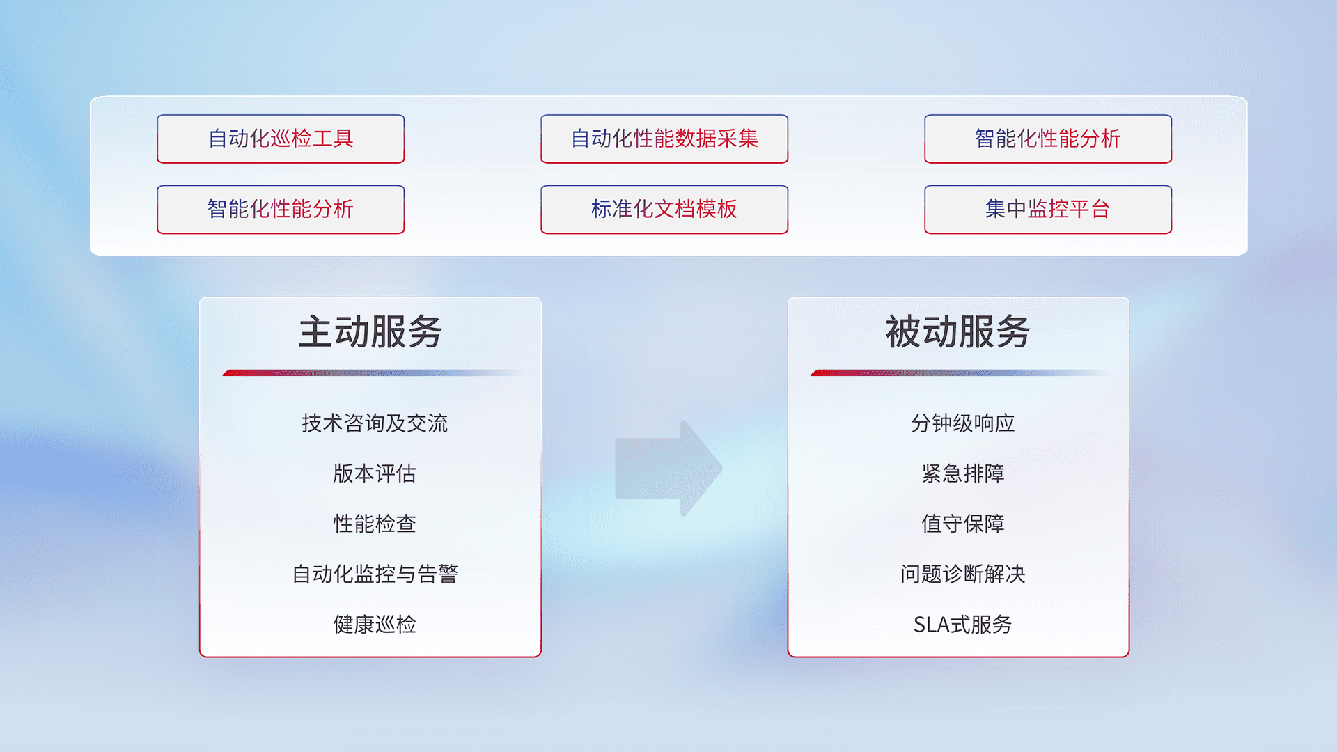 智能化工具和标准化文档,,,保障服务质量,,,,提供主动服务(包含技术咨询、、、版本评估、、、、性能检查、、自动化监控与告警、、、健康巡检)和被动服务包含(分钟级响应、、、紧急排障、、值守保障、、、、问题诊断解决、、SLA服务)。。。