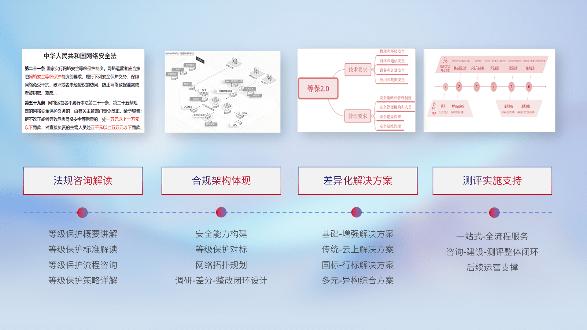 通过专业的法律咨询解读、、、、合规架构体现、、差异化解决方案、、测试实施支持等服务,,,,为客户量身打造等保合规体系。。。